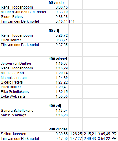 Naomi Janssen (20+) verbeterde haar PR op de 25 rug met 0.09 seconde en tekende ook voor de overwinning. Op de 50 vlinder werd ze tweede. Haar zus Selina won de 100 vlinder én 400 vrij bij de 25+. Elke Schellekens (30+) won de 25 rug, ondanks een slechte en pijnlijke aantik. Op de 25 school werd ze derde en op zowel de 25 als de 50 vrij eindigde ze als vierde. Sandra Schellekens won bij de 35+ de 25 school, die ze naast Elke zwom, en de 50 vrij. Op zowel de 100 school als 100 wissel werd ze tweede. Rob van de Ven werd tweede op de 100 meter schoolslag bij de heren 50+ en eindigde als derde op zowel de 25 als 200 vrij.